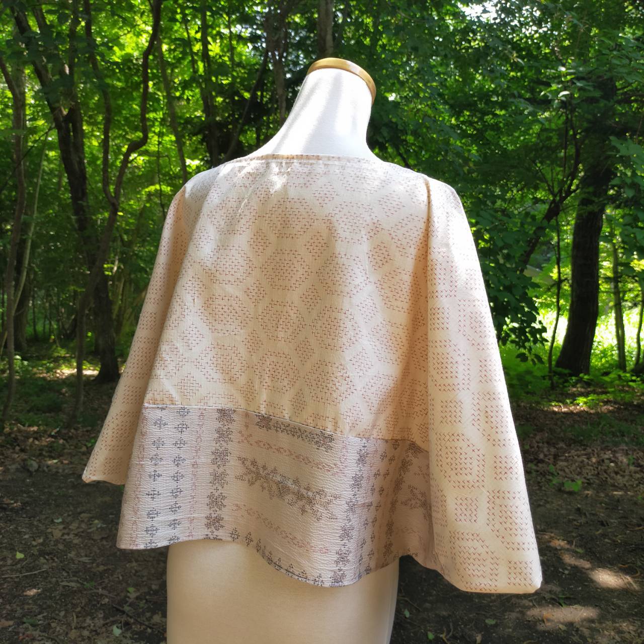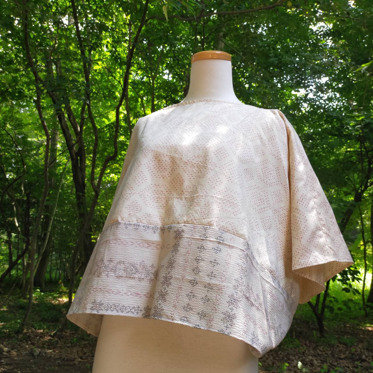 やさしい風合いのちりめんと紬の2種類を使って着物をリメイクして仕立てた、ドルマンブラウスです。