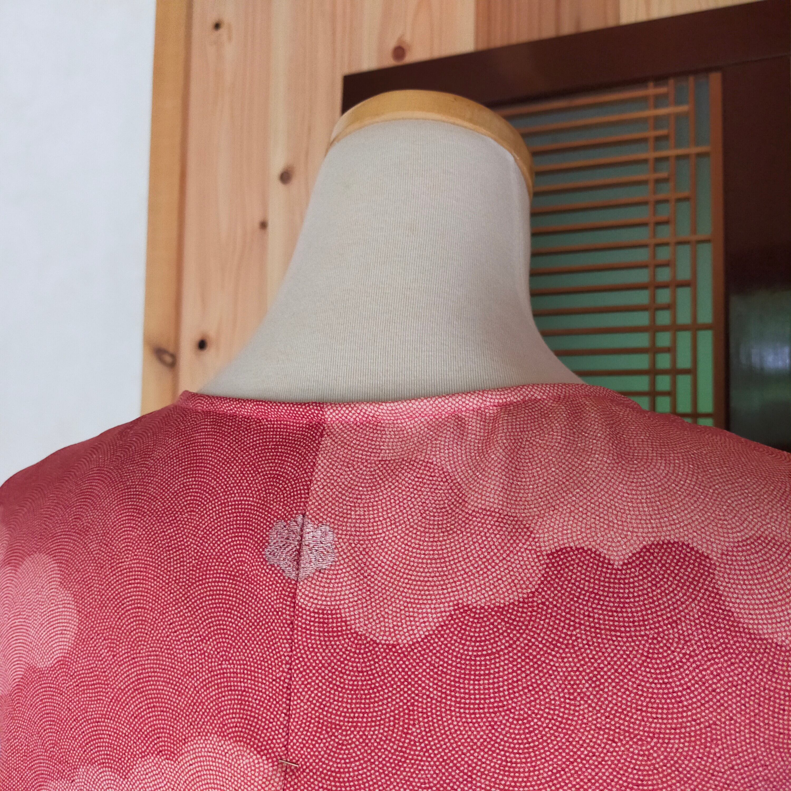 後ろに家紋がデザインされたこのフレアワンピースは、柔らかい正絹素材を使用しており、その風合いが優雅さを引き立てます。