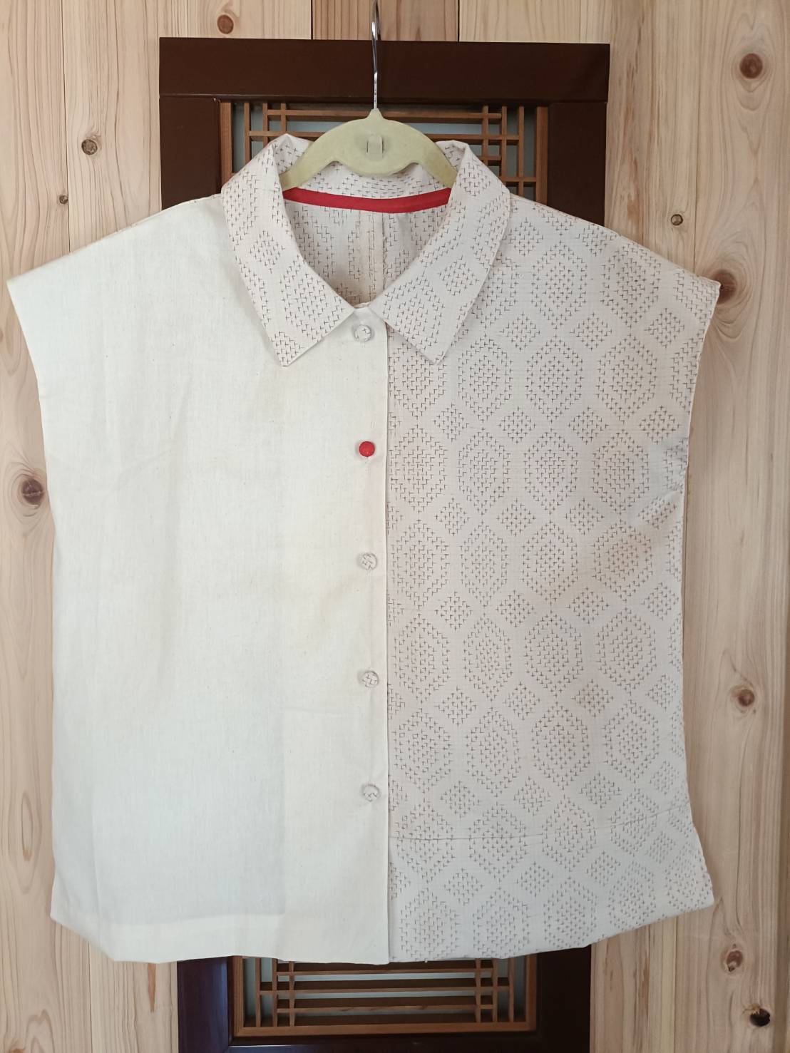 二段目のボタンは、ワンポイントに赤のクルミボタンにしてみました
