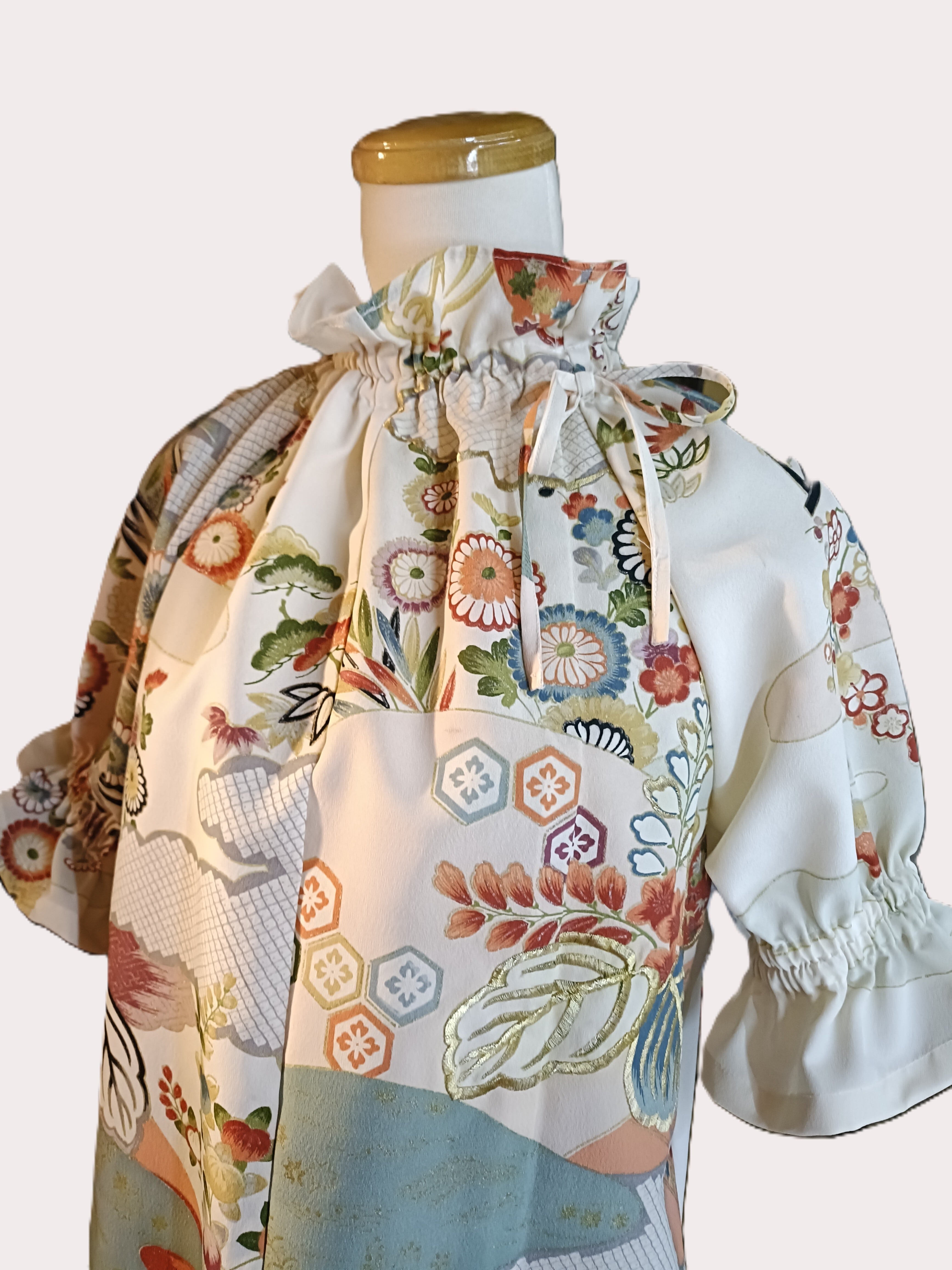 着物を一度ほどき、現代の装いとして丁寧に仕立て直したリメイクトップスです。