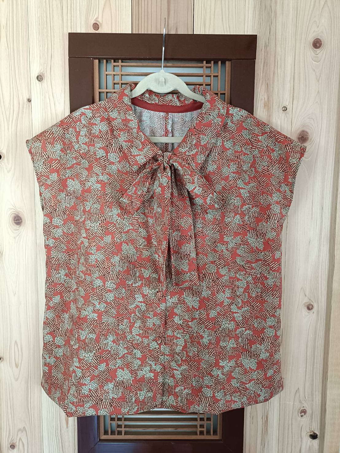 木綿の着物を解いて製作した、着心地の良いボウタイブラウス。